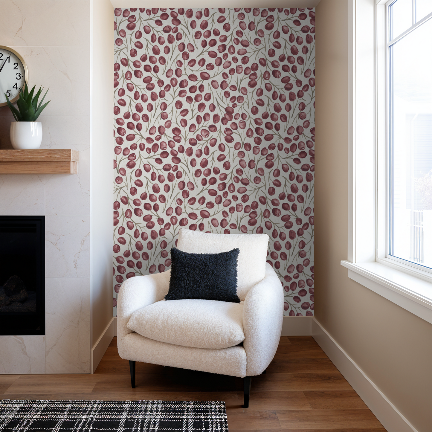 Wrap your space in nature’s warmth with Hawthorn Berries, a hand-painted watercolour wallpaper that celebrates the quiet beauty of seasonal transition. Rich cranberry-red berries delicately cluster along olive stems, painted with softness and intention—bringing a sense of rootedness, wild abundance, and vintage charm to your walls.