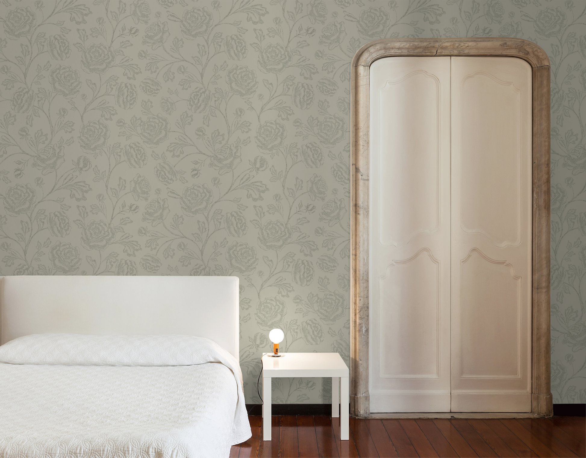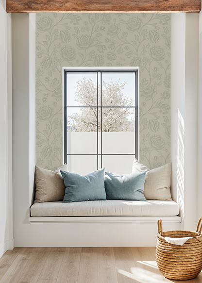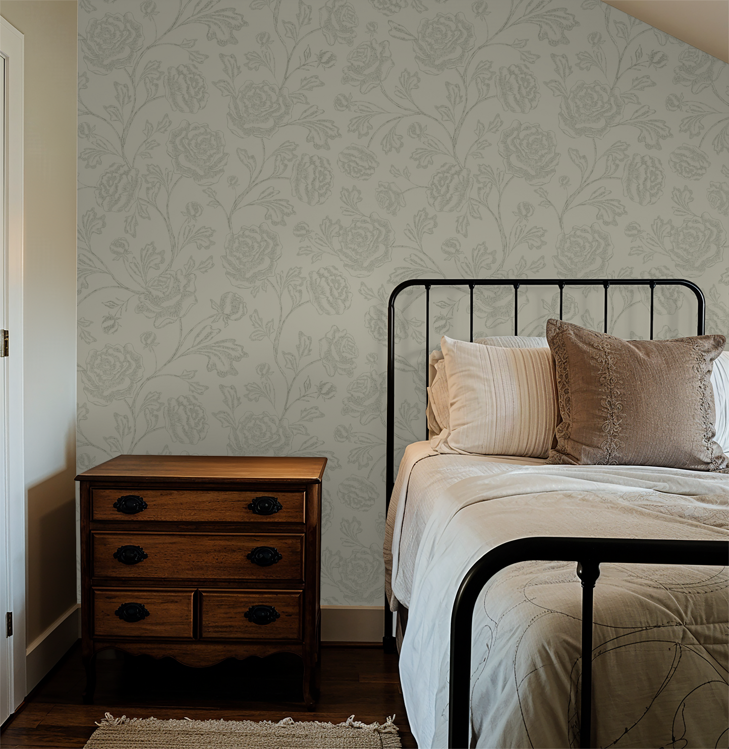 A perfect match for Heritage Revival, Romantic Traditional, French country, or moody English cottage spaces, this wallpaper pairs beautifully with vintage furnishings, heirloom wood tones, and soft, layered textiles. The monochrome palette adds visual drama without overwhelming the senses—ideal for full-room coverage or statement moments.