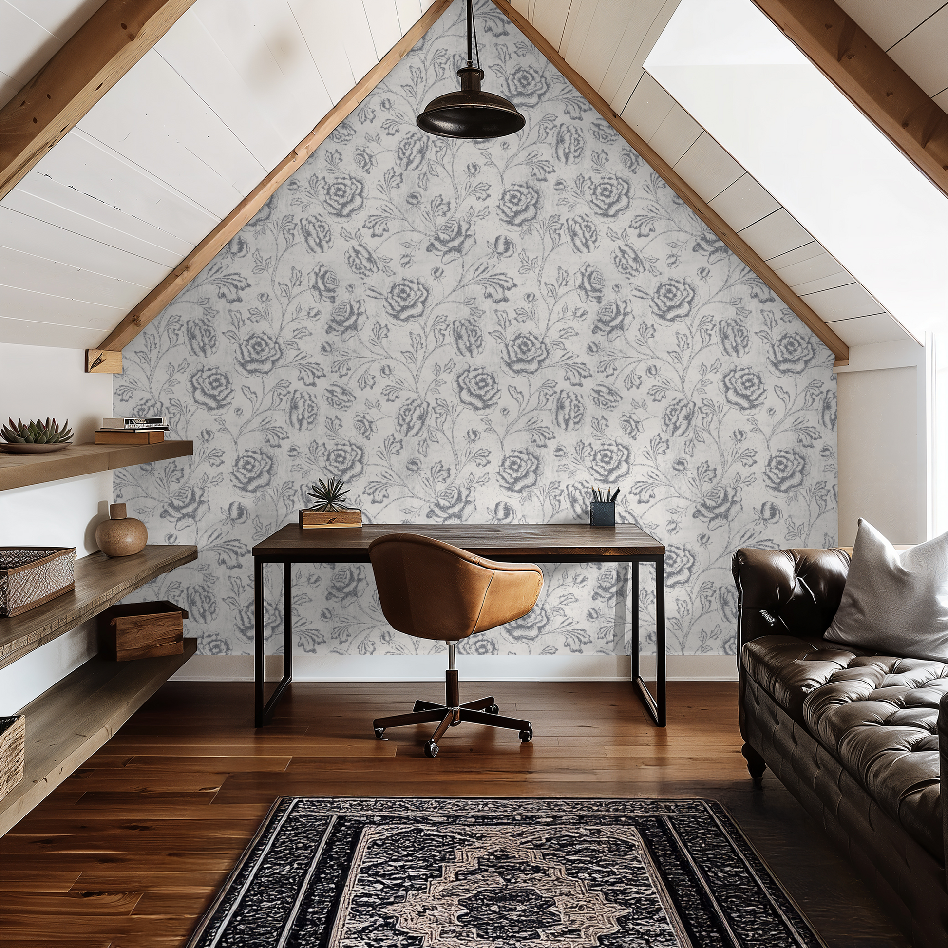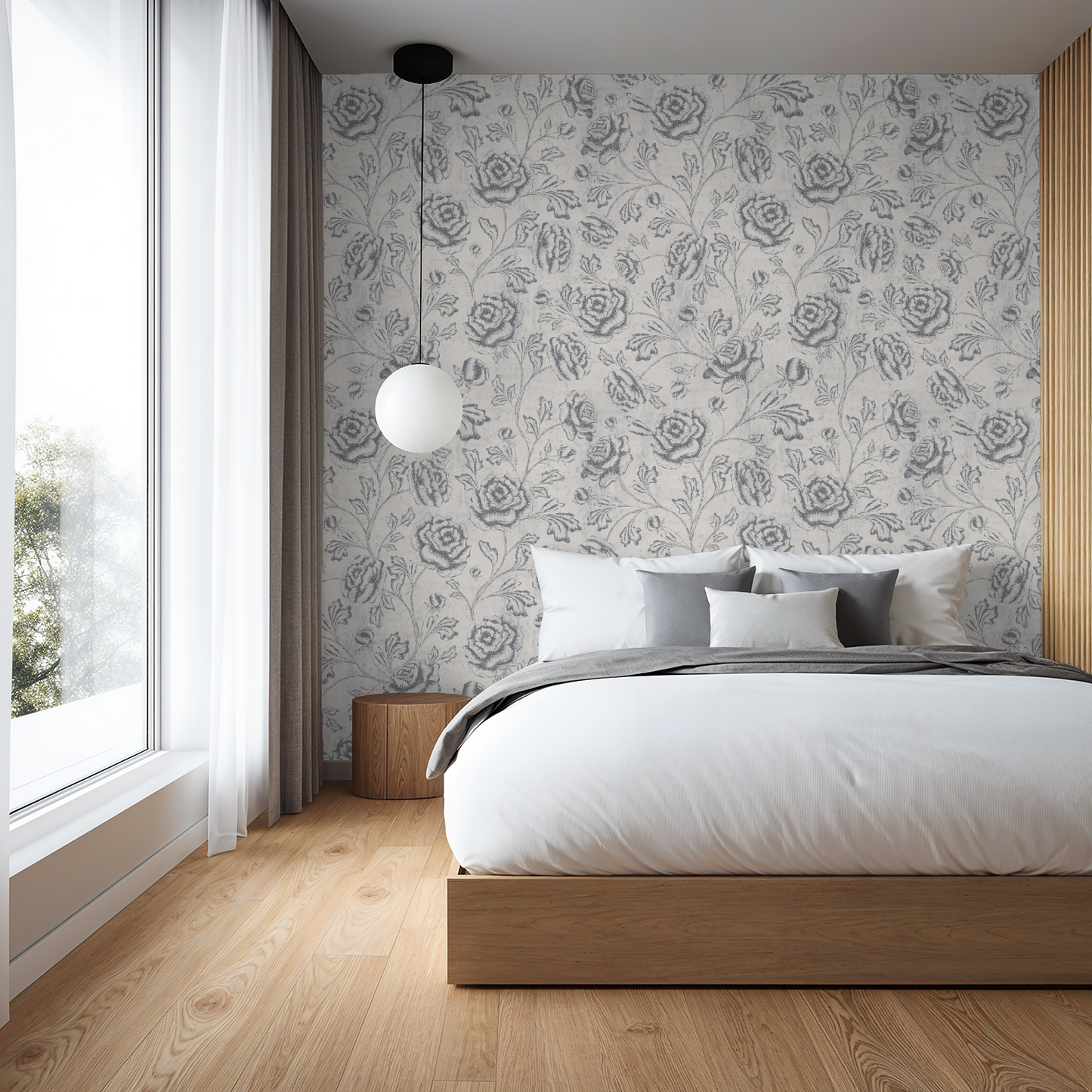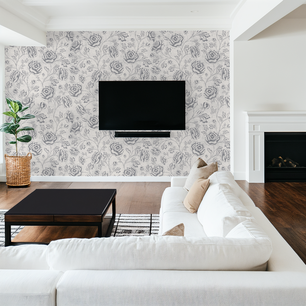 A perfect match for Heritage Revival, Romantic Traditional, French country, or moody English cottage spaces, this wallpaper pairs beautifully with vintage furnishings, heirloom wood tones, and soft, layered textiles. The monochrome palette adds visual drama without overwhelming the senses—ideal for full-room coverage or statement moments.