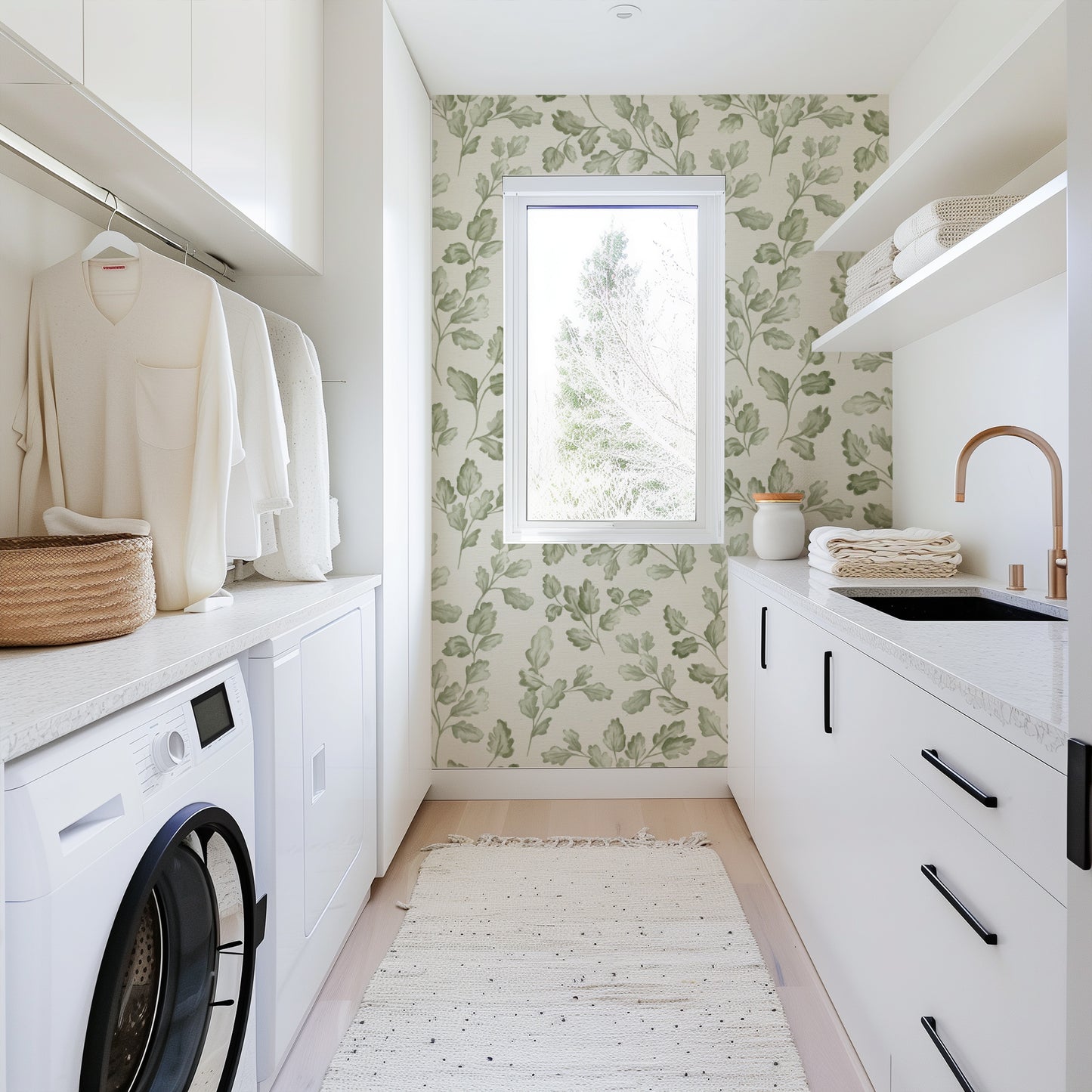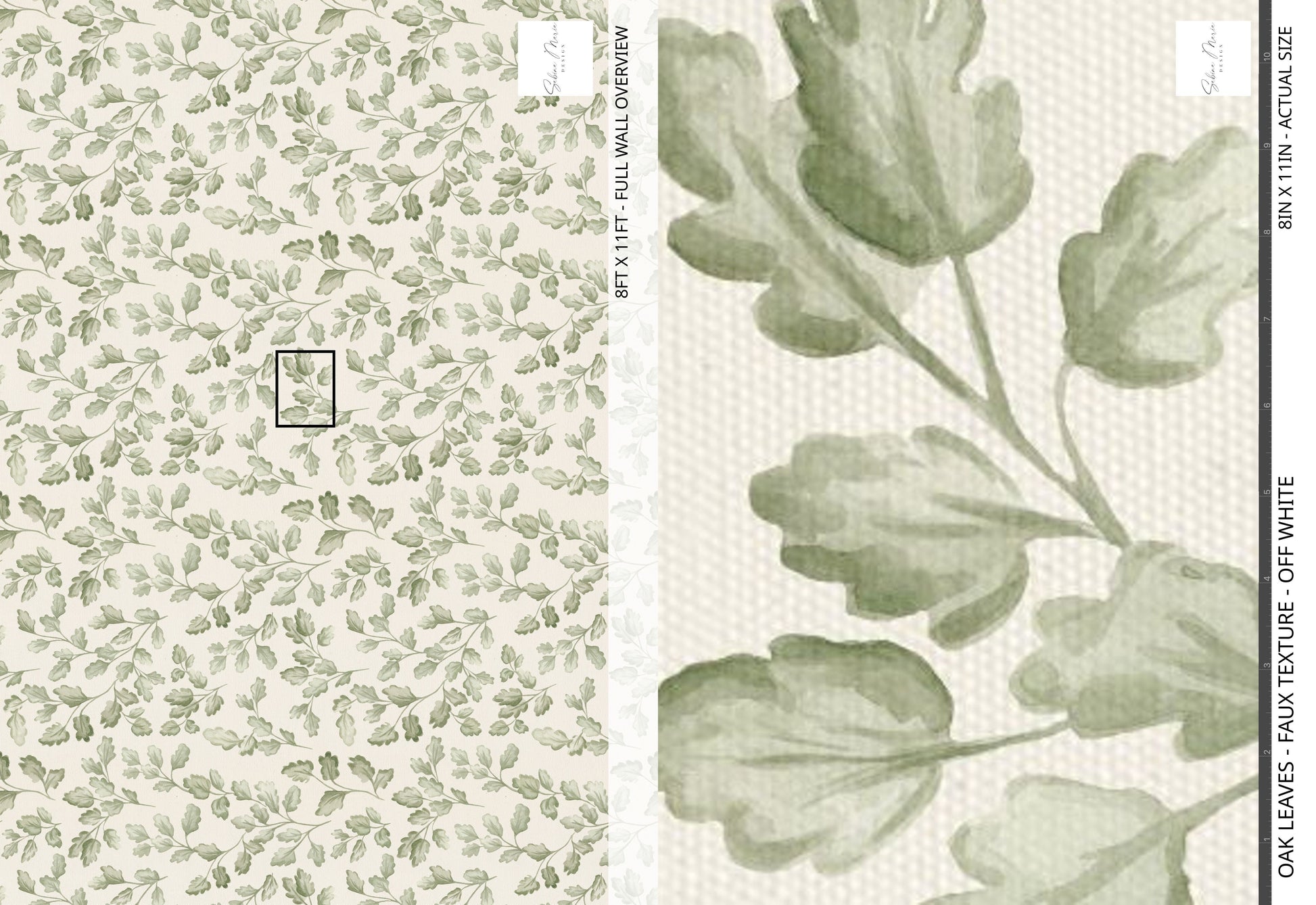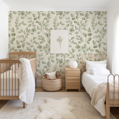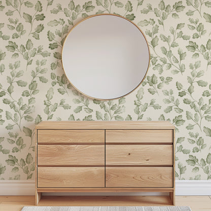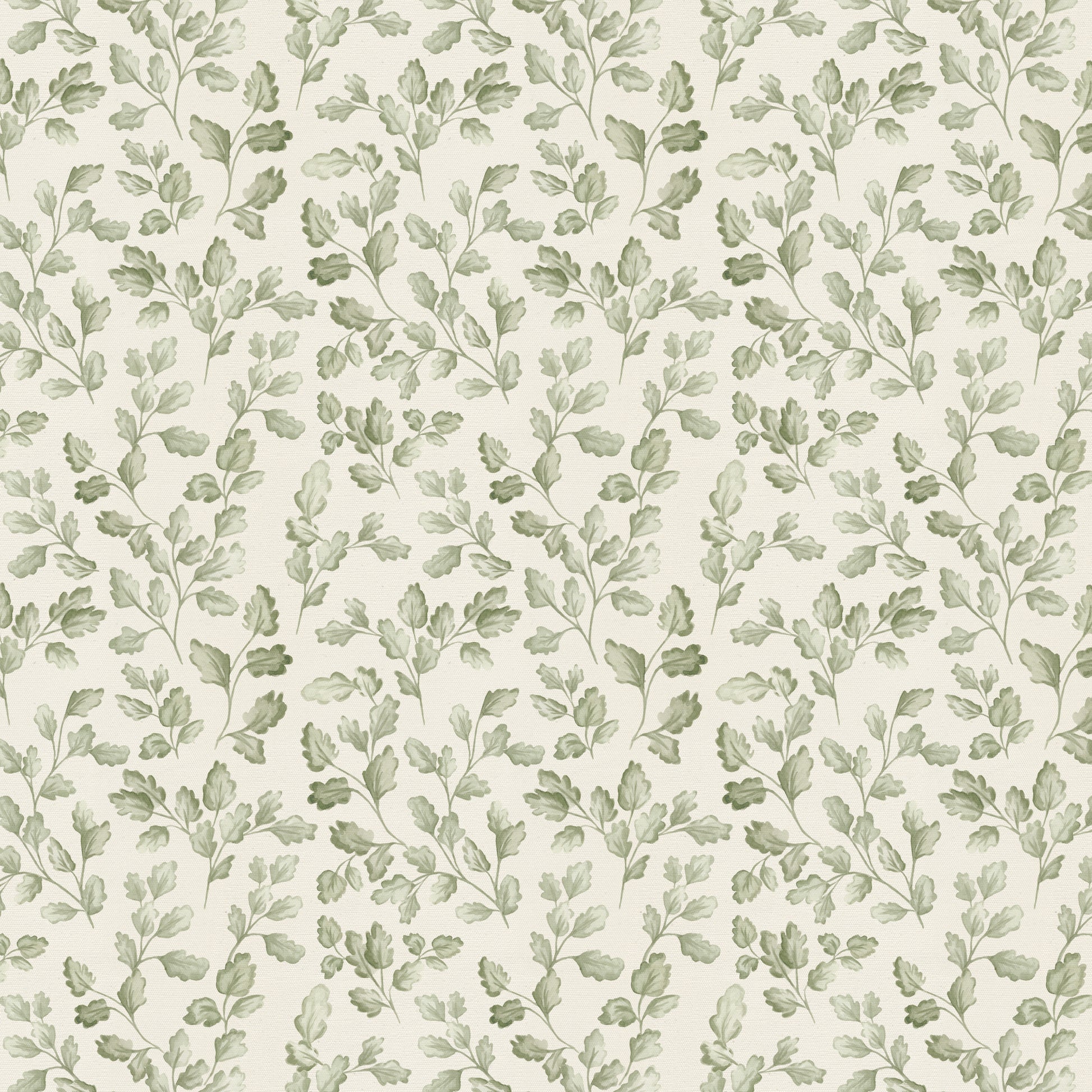 Oak Leaves – Ivory is a soft, nature-inspired wallpaper design featuring delicate hand-painted oak leaves in a soothing palette of sage green and warm ivory. Each brushstroke evokes the calm rhythm of nature, creating an airy, organic ambiance that feels equal parts cozy and refined.