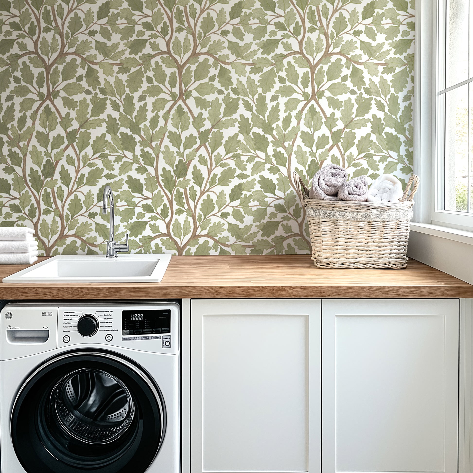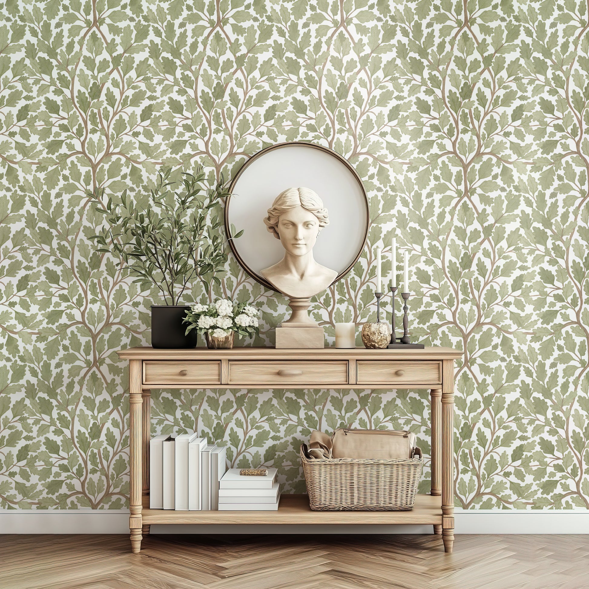 With its organic silhouette style and soft textural details, Oaks of Avalon brings depth and elegance to interiors while remaining versatile and understated. Perfect for English-inspired entryways, cozy reading corners, heritage revival bedrooms, moody dining rooms, or nature-infused powder rooms, this wallpaper lends a sense of grounded beauty to any space.