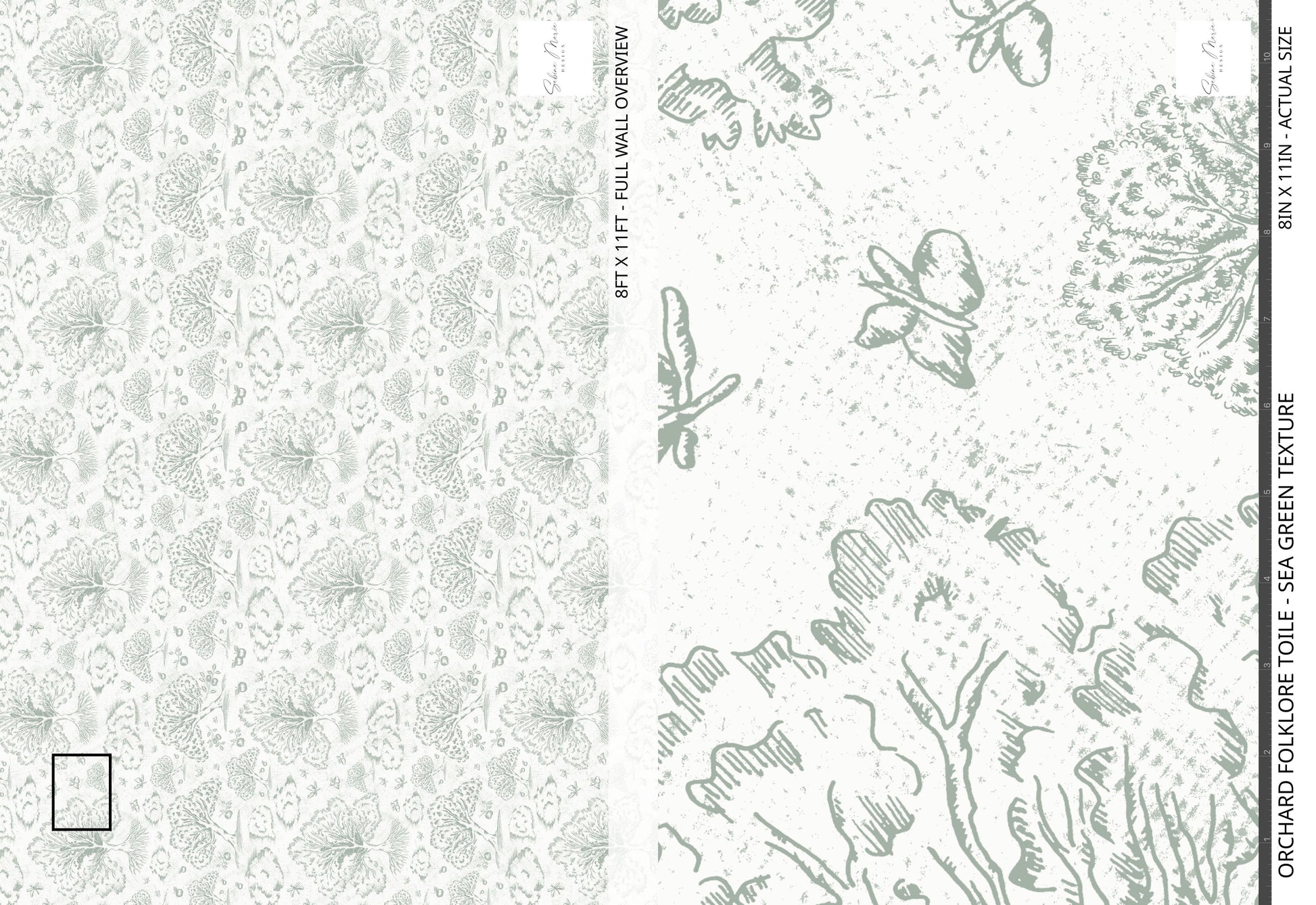 Bring a touch of enchantment into your home with Orchard Folklore Toile, a hand-illustrated wallpaper that draws from European countryside tales, antique etchings, and the quiet magic of nature. Each toile-style scene features apple orchard from the Abbey, fluttering butterflies and dragonflies, grounded roots from fairy trees, and soft meadow clouds—arranged in a gentle repeat that evokes both childhood wonder and pastoral nostalgia. Originally hand drawn, the delicate lines and heritage-inspired texture give this wallpaper an heirloom feel.