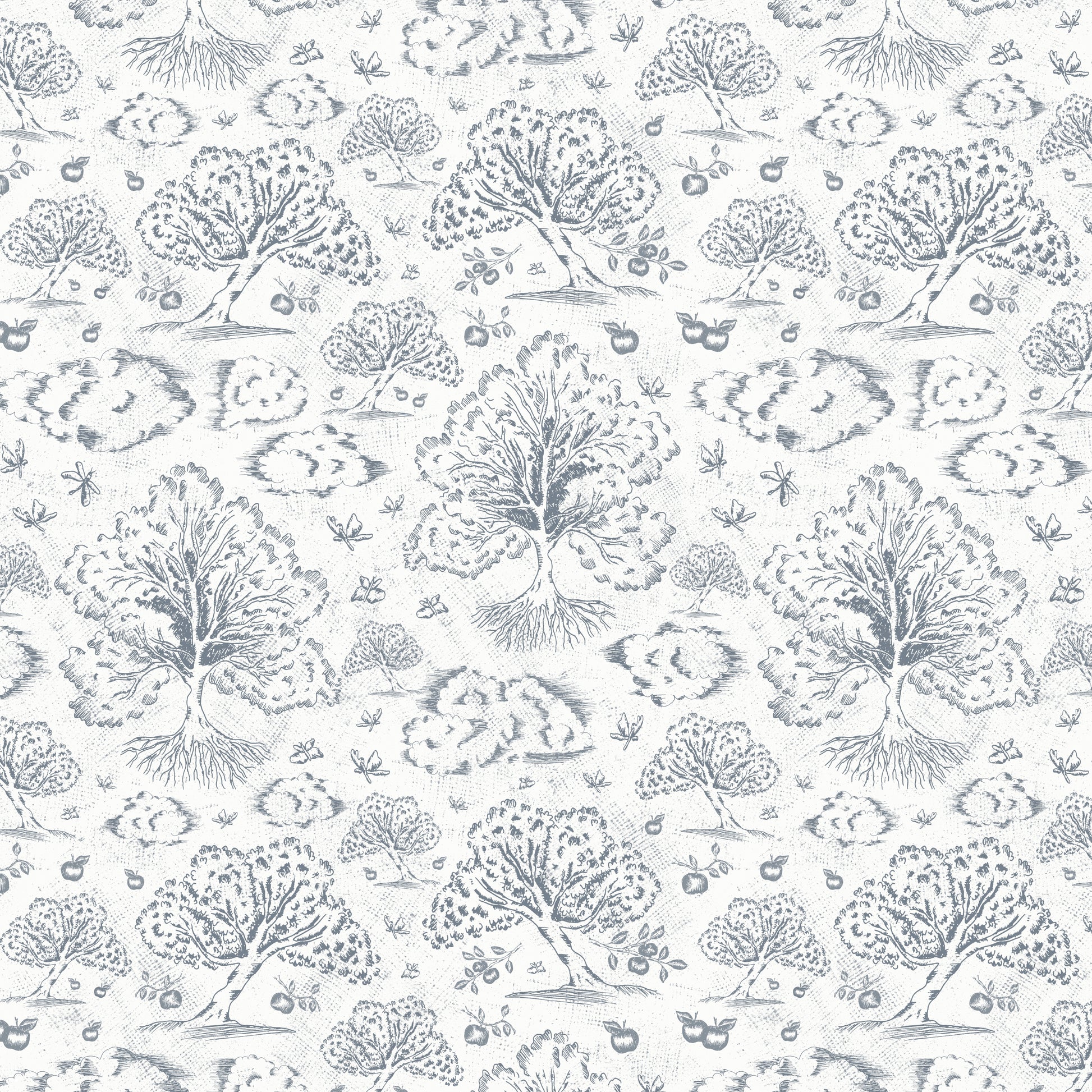 Bring a touch of enchantment into your home with Orchard Folklore Toile, a hand-illustrated wallpaper that draws from European countryside tales, antique etchings, and the quiet magic of nature. Each toile-style scene features apple orchard from the Abbey, fluttering butterflies and dragonflies, grounded roots from fairy trees, and soft meadow clouds—arranged in a gentle repeat that evokes both childhood wonder and pastoral nostalgia. Originally hand drawn, the delicate lines and heritage-inspired texture give this wallpaper an heirloom feel.