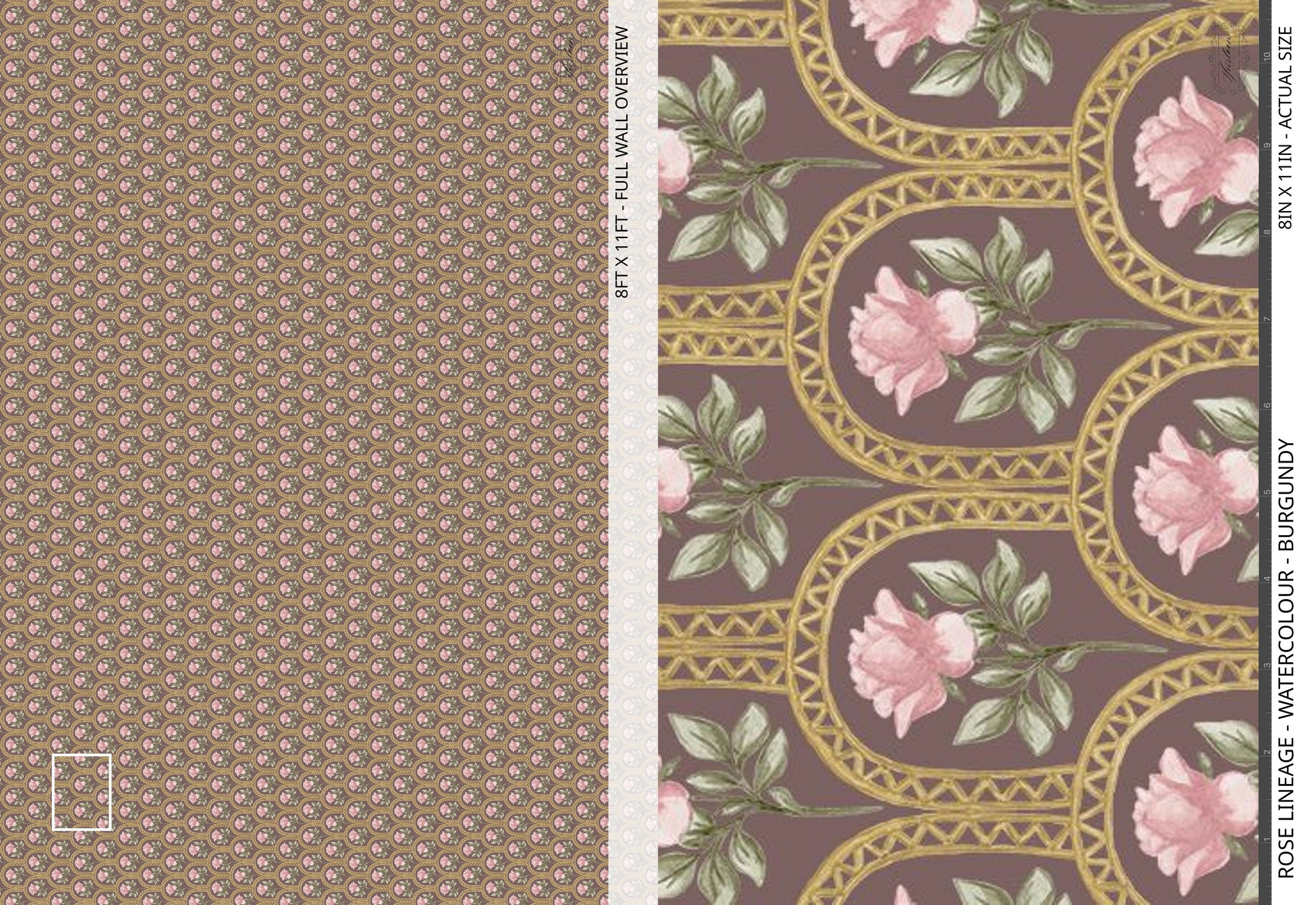 Elevate your walls with Rose Lineage – Watercolour, a hand-painted wallpaper featuring delicate pink roses framed within golden arched motifs. This design is a soft nod to heritage, weaving timeless florals with artful symmetry in a fresh, refined palette. The blush blooms and gentle sage greens sit atop warm ivory or clean white grounds, creating a graceful balance of femininity and structure.