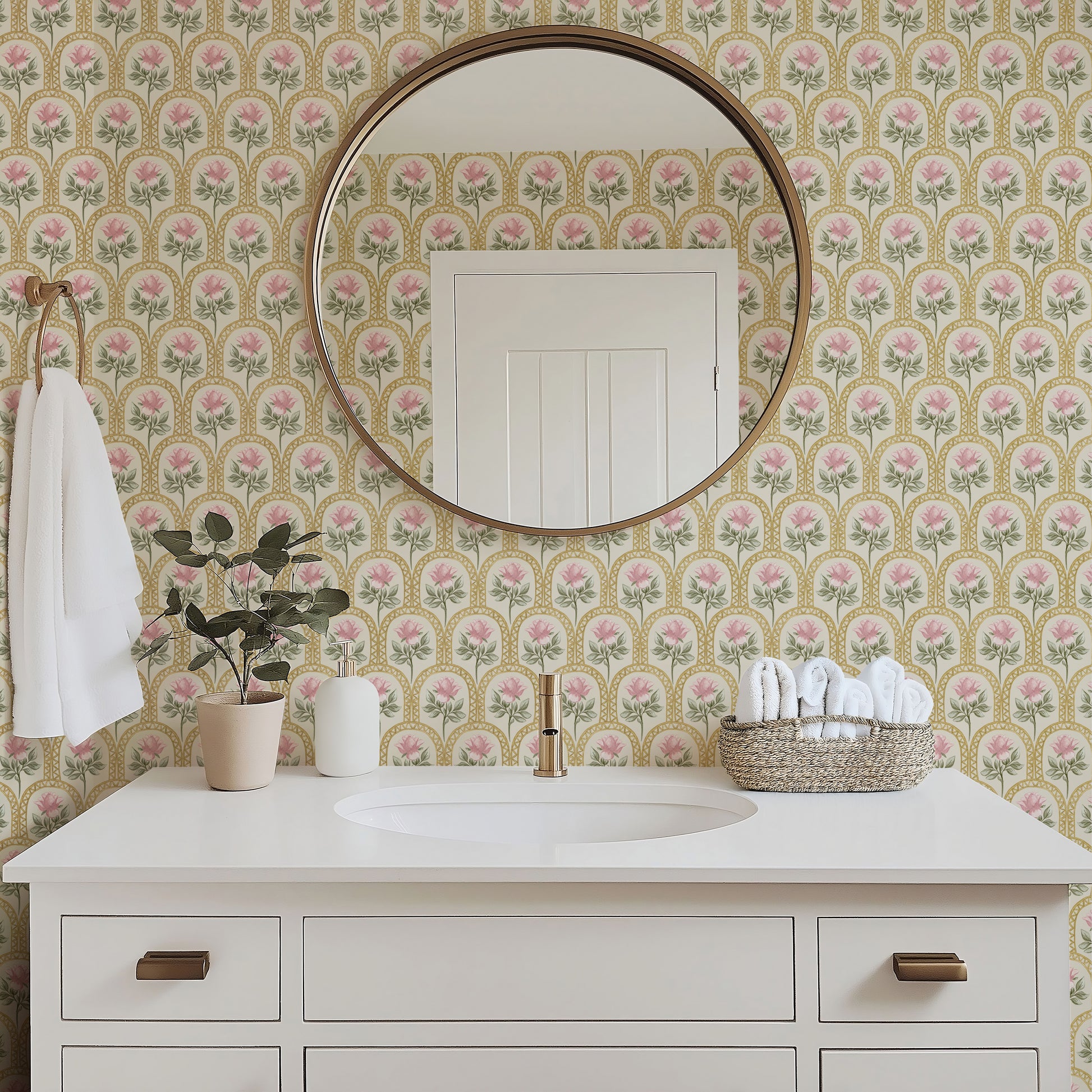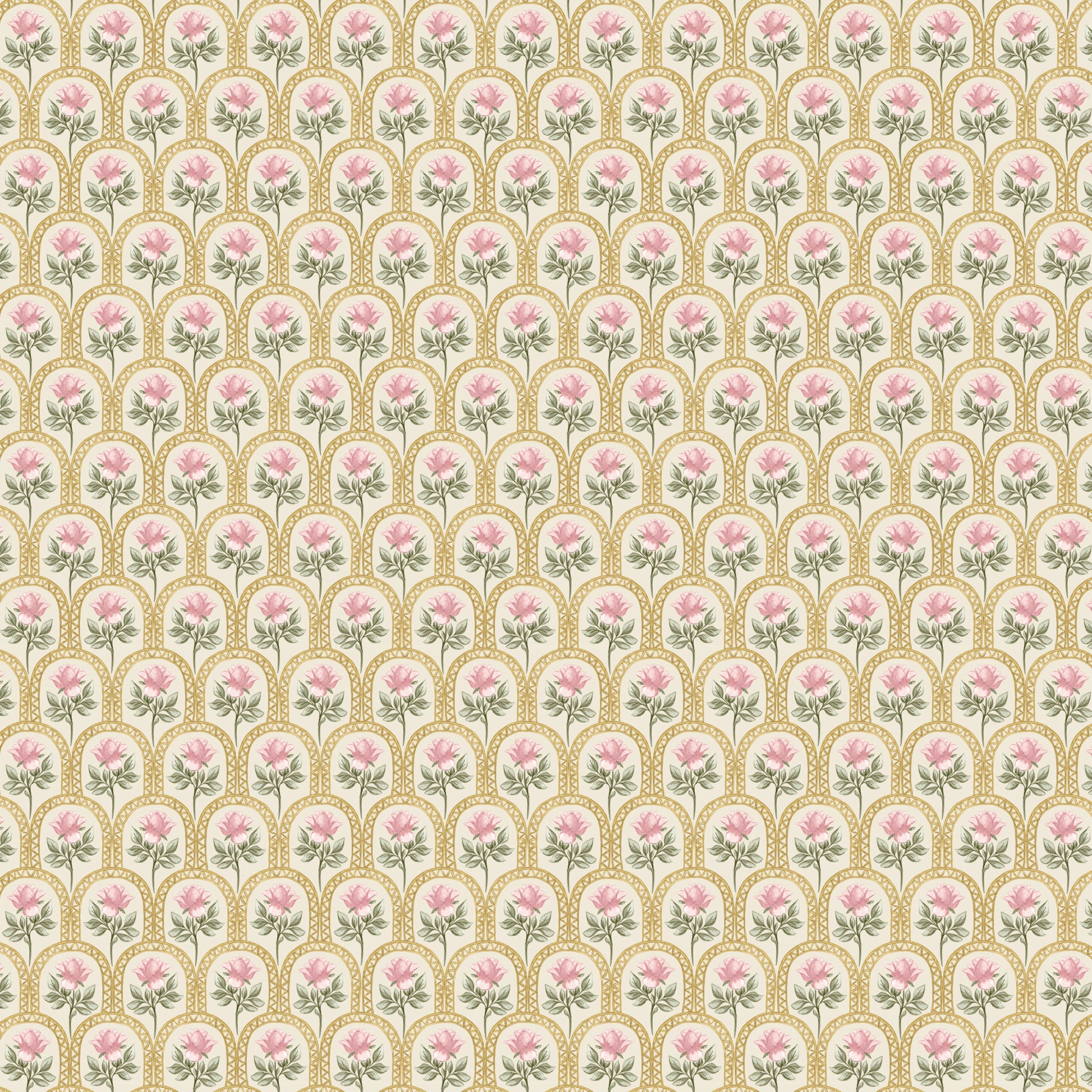 Elevate your walls with Rose Lineage – Watercolour, a hand-painted wallpaper featuring delicate pink roses framed within golden arched motifs. This design is a soft nod to heritage, weaving timeless florals with artful symmetry in a fresh, refined palette. The blush blooms and gentle sage greens sit atop warm ivory or clean white grounds, creating a graceful balance of femininity and structure.