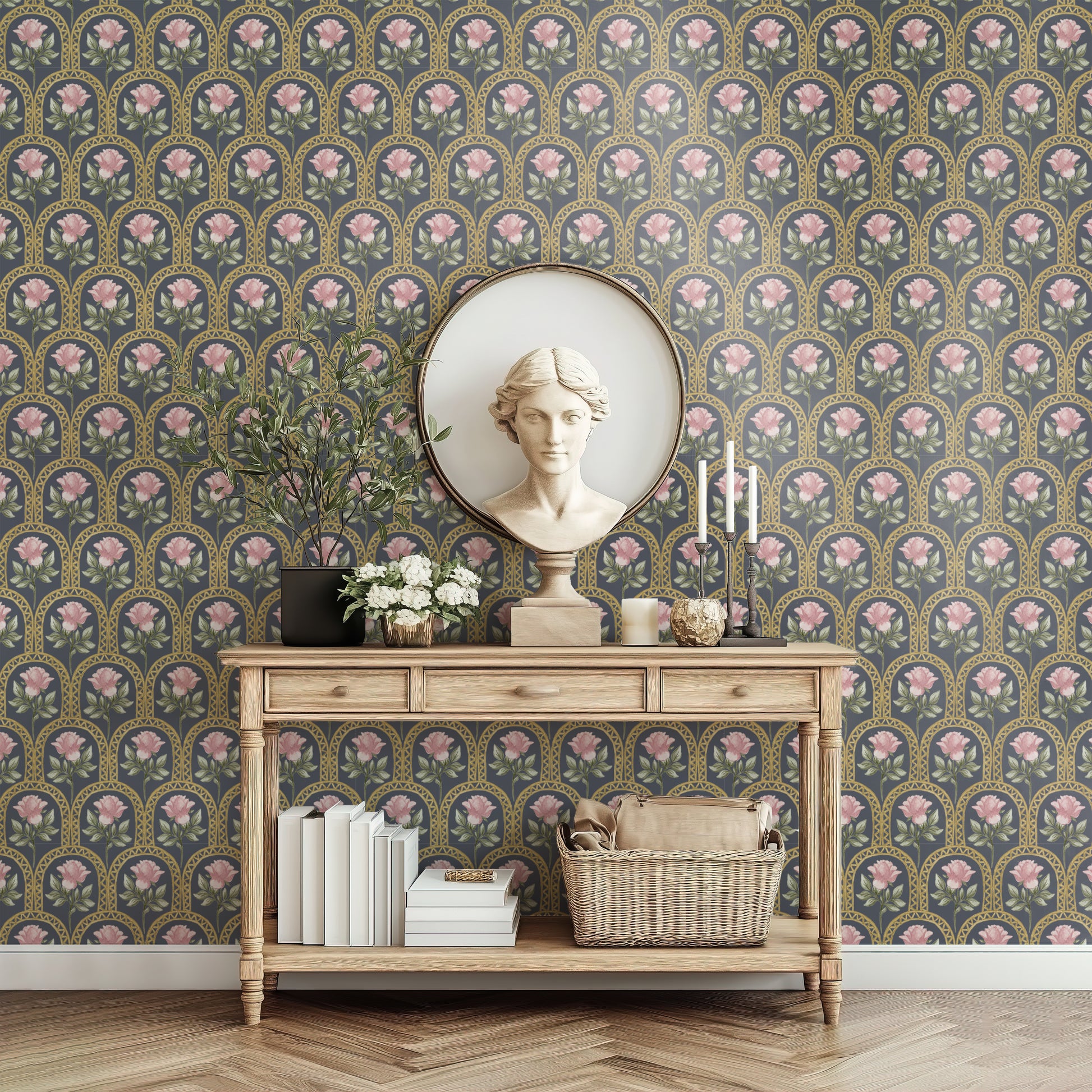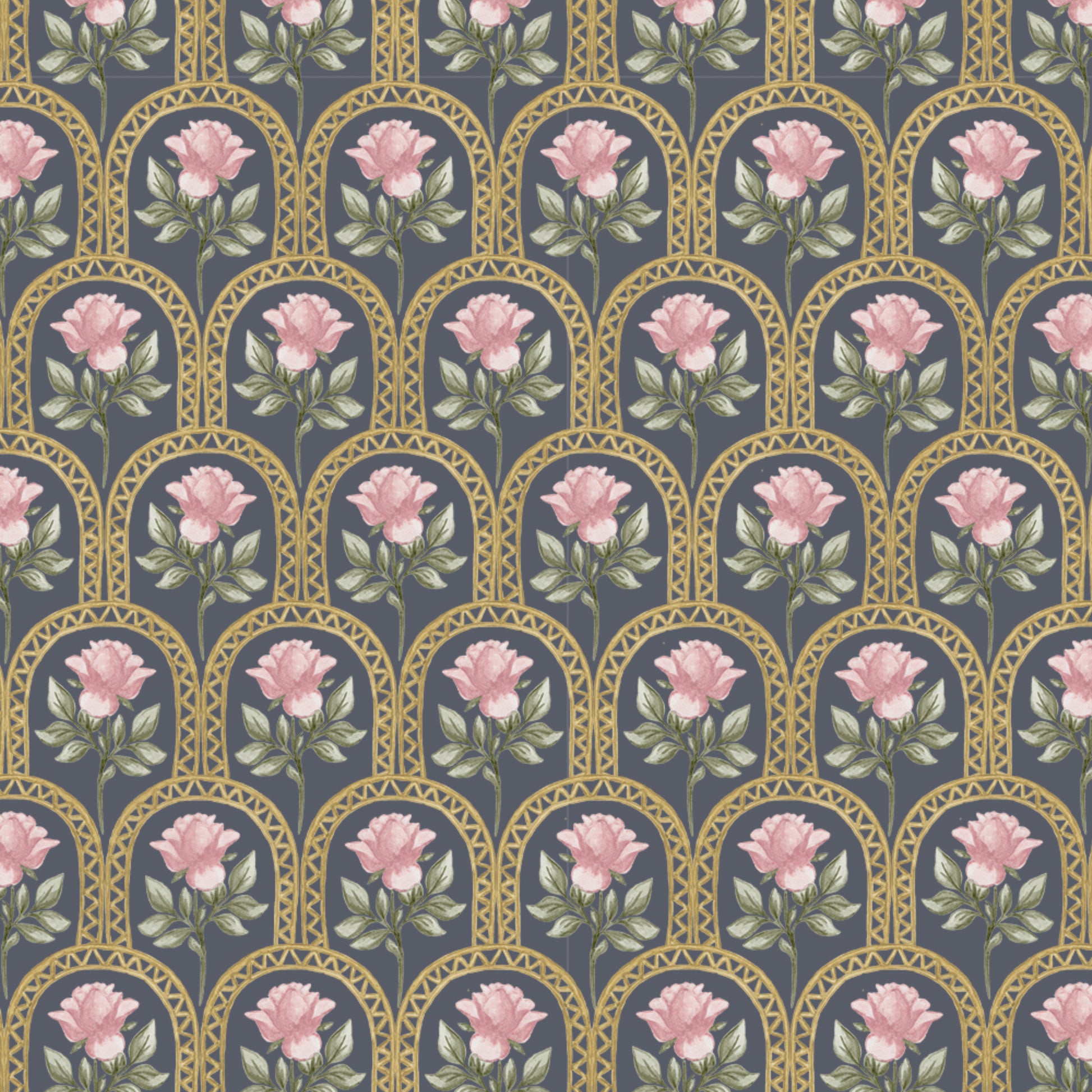 Elevate your walls with Rose Lineage – Watercolour, a hand-painted wallpaper featuring delicate pink roses framed within golden arched motifs. This design is a soft nod to heritage, weaving timeless florals with artful symmetry in a fresh, refined palette. The blush blooms and gentle sage greens sit atop warm ivory or clean white grounds, creating a graceful balance of femininity and structure.
