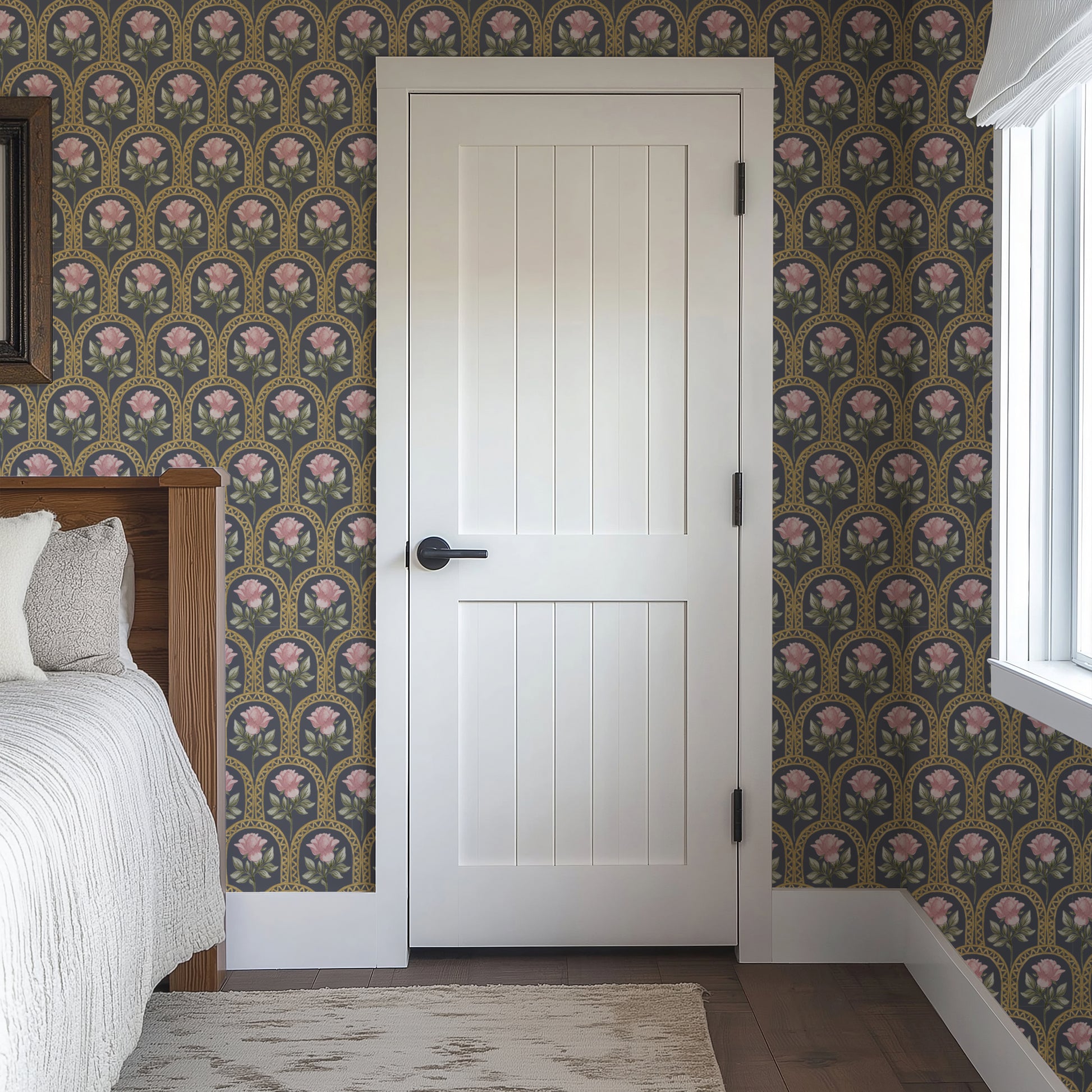 Perfect for nursery feature walls, romantic powder rooms, heritage-inspired entryways, or traditional bedrooms seeking charm and gentleness. Its repeating arch pattern adds visual rhythm, while the watercolour textures bring a touch of softness and storybook nostalgia.
